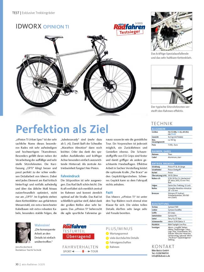 Erneut gewinnt unser Modell oPinion Ti den Vergleichstest “Titan Bikes” in der aktuellen Ausgabe des RADfahren Magazins mit der Bestnote 1,2. Fazit der Tester: “Das idworx oPinion Ti kostet sehr viel Geld. Es gibt aber aktuell wohl kein stimmigeres, besseres Trekkingrad auf dem Markt. Der Einsatz für den Perfektionismus macht sich voll bezahlt.”