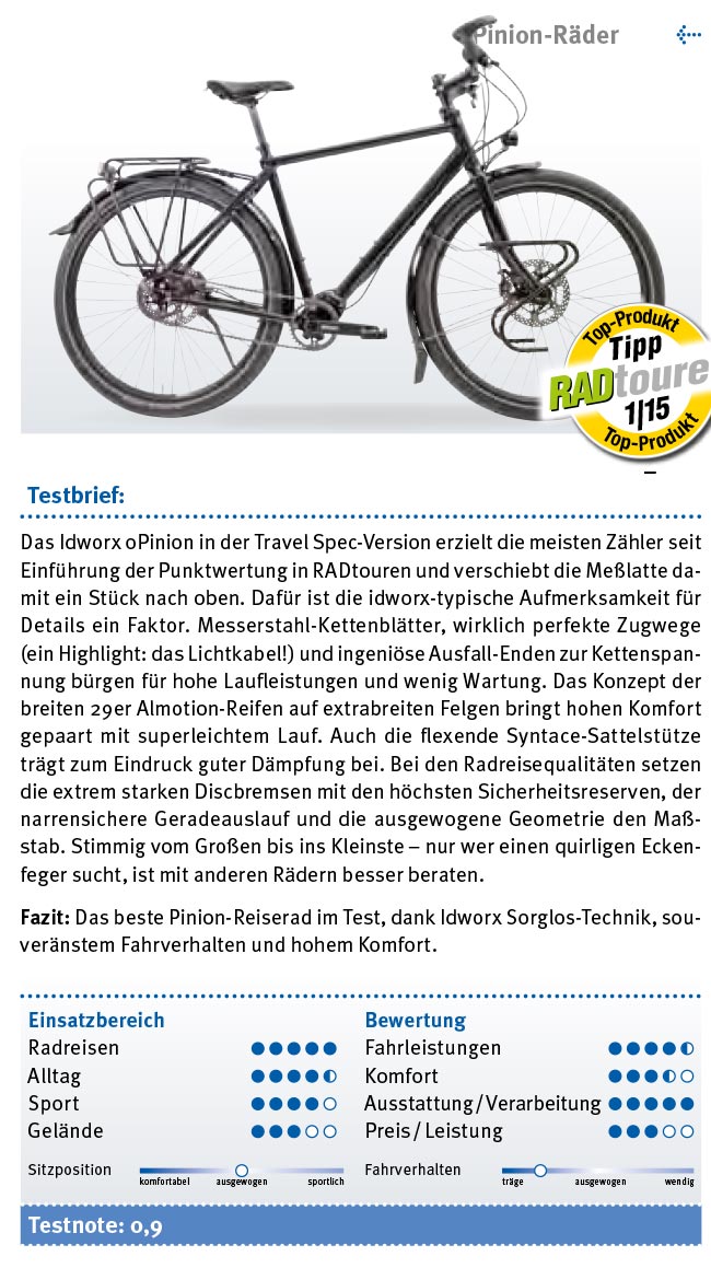 Fazit: Das beste Pinion-Reiserad im Test, dank idworx Sorglos-Technik, souveränstem Fahrverhalten und hohem Komfort. Das idworx oPinion in der Travel Spec-Version erzielt die meisten Zähler seit Einführung der Punktwertung in RADtouren und verschiebt die Meßlatte damit ein Stück nach oben.